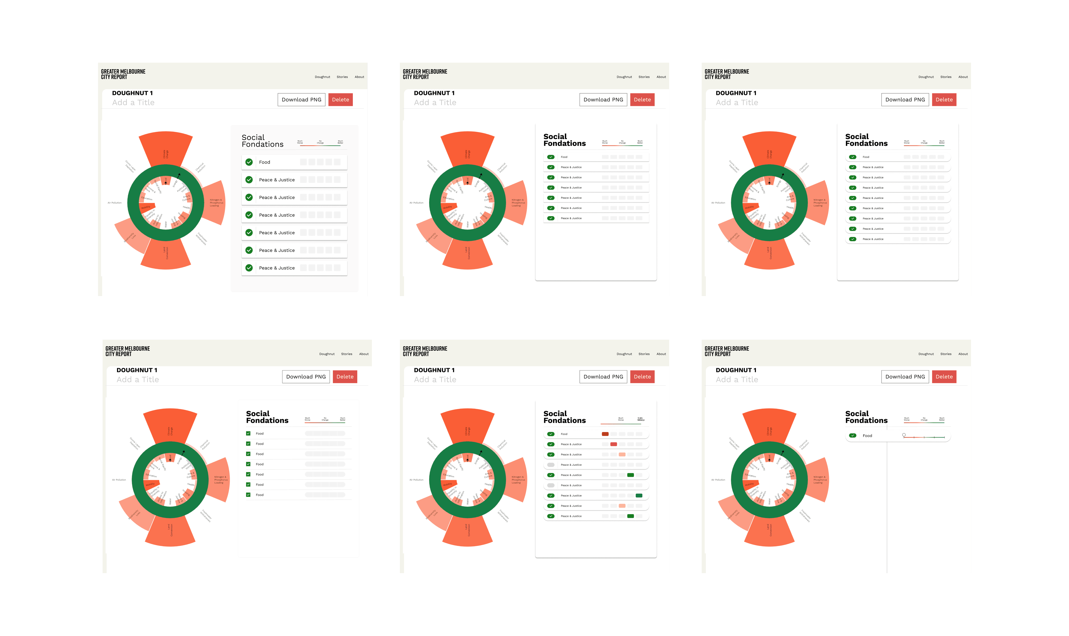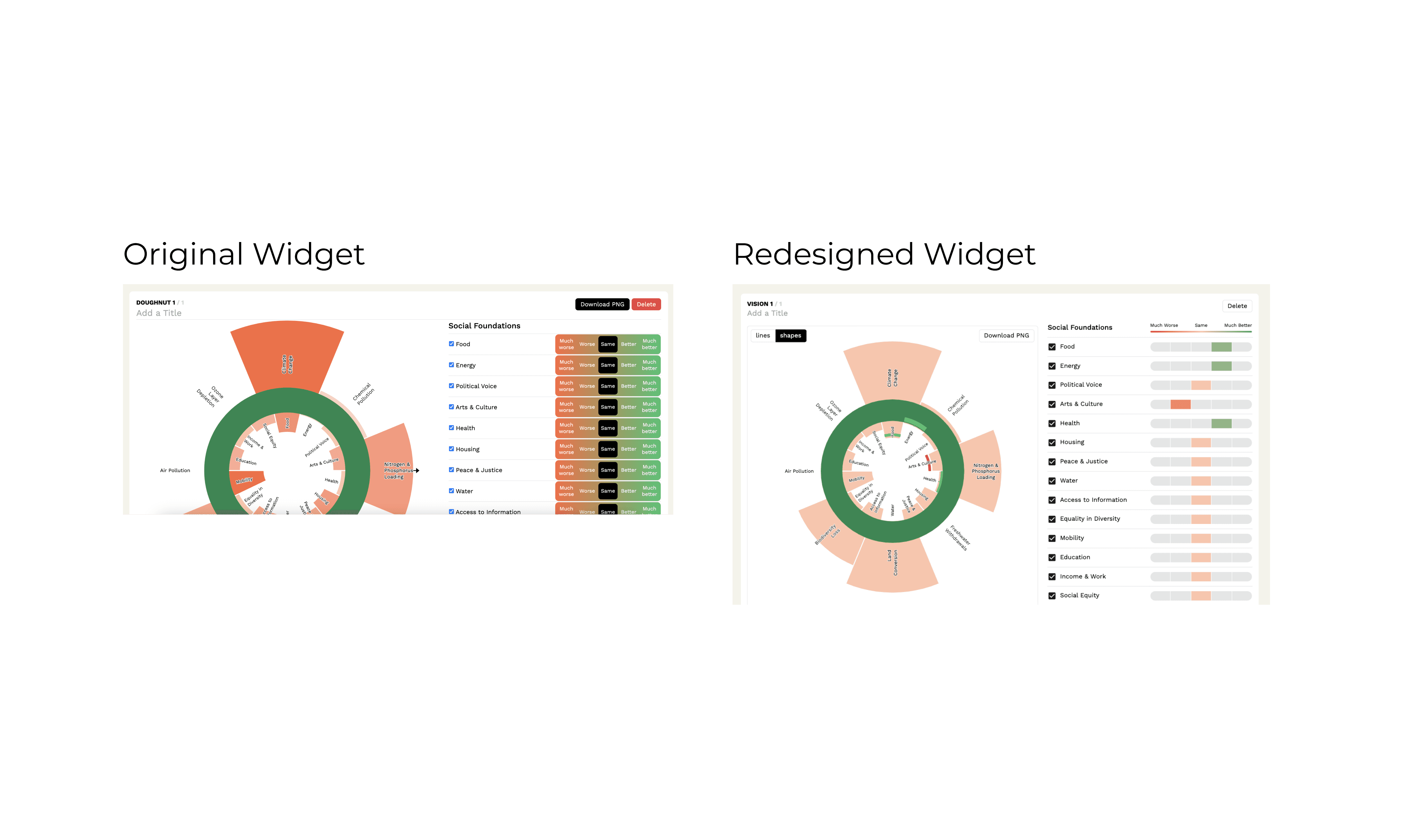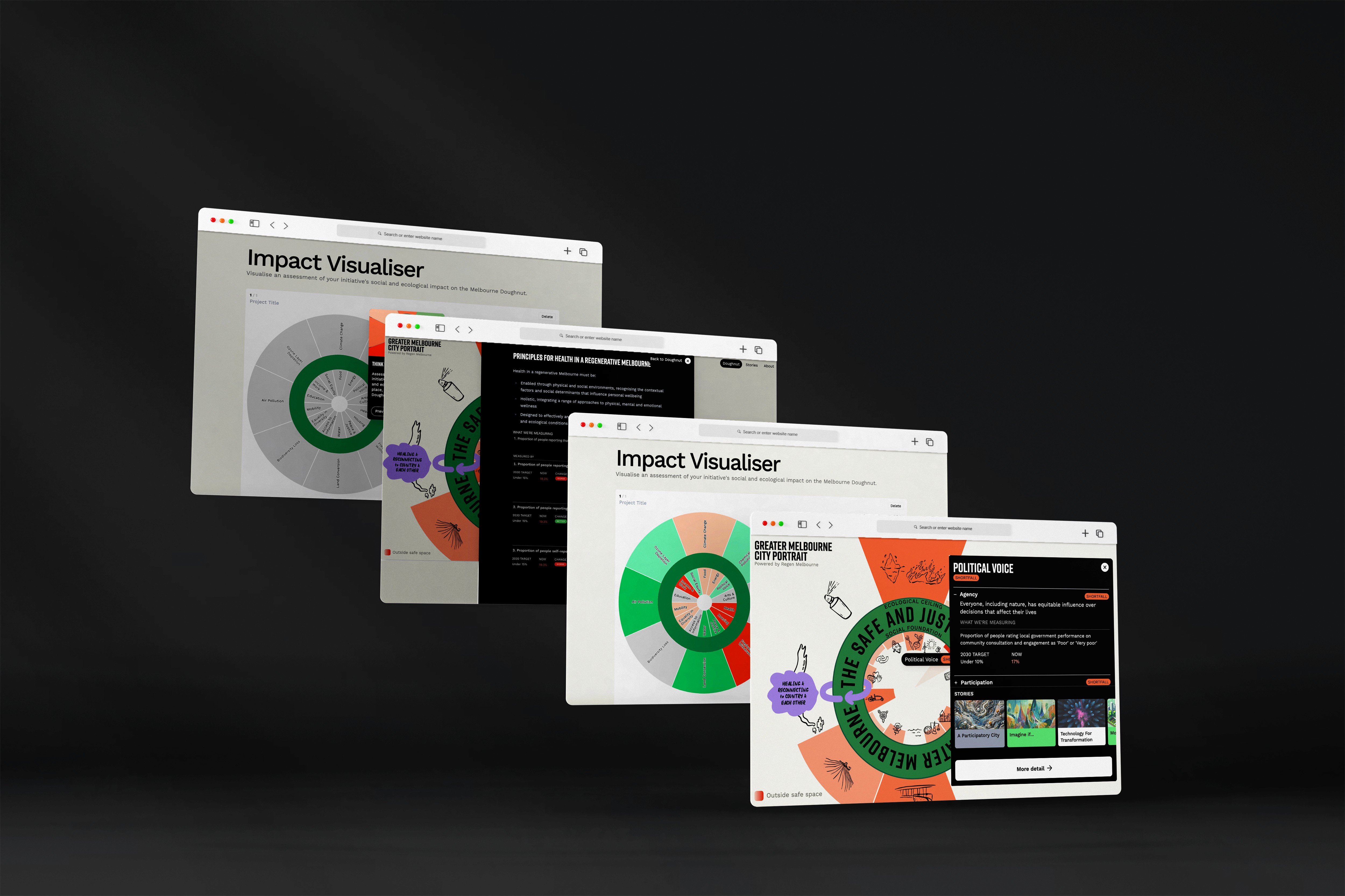 The Doughnut Economics framework helps policymakers and entrepreneurs visualize the social and ecological footprints of their developments. We translated this complex academic theory into an interactive web widget, making these assessments instantly readable for decision-makers. Beyond the interface, I designed a visual system to solve critical accessibility challenges, ensuring the strict data standards remained legible while transforming a theoretical model into a practical strategic tool.