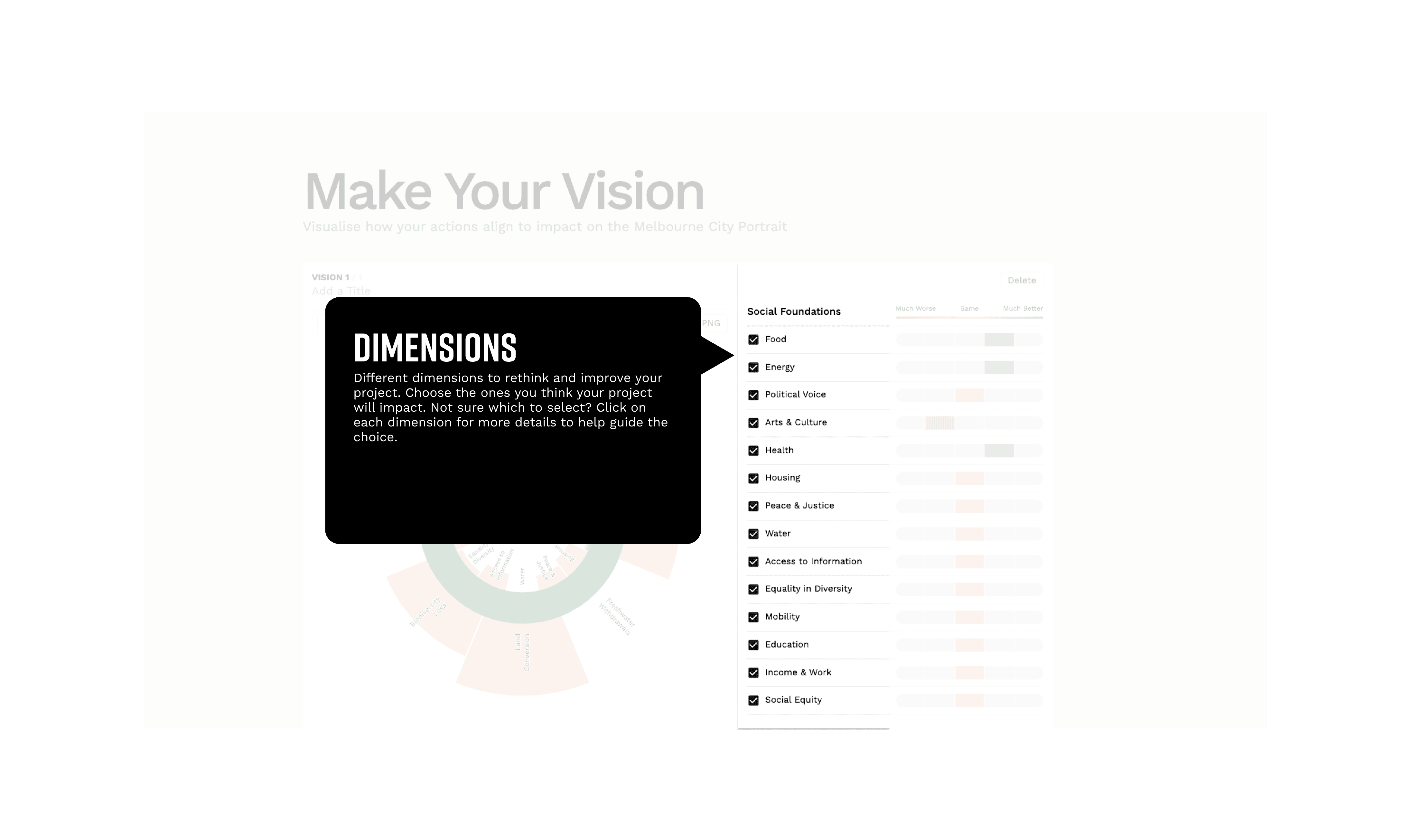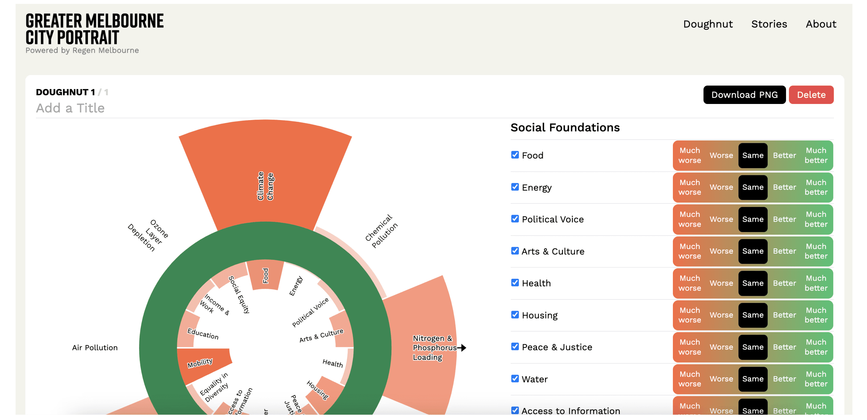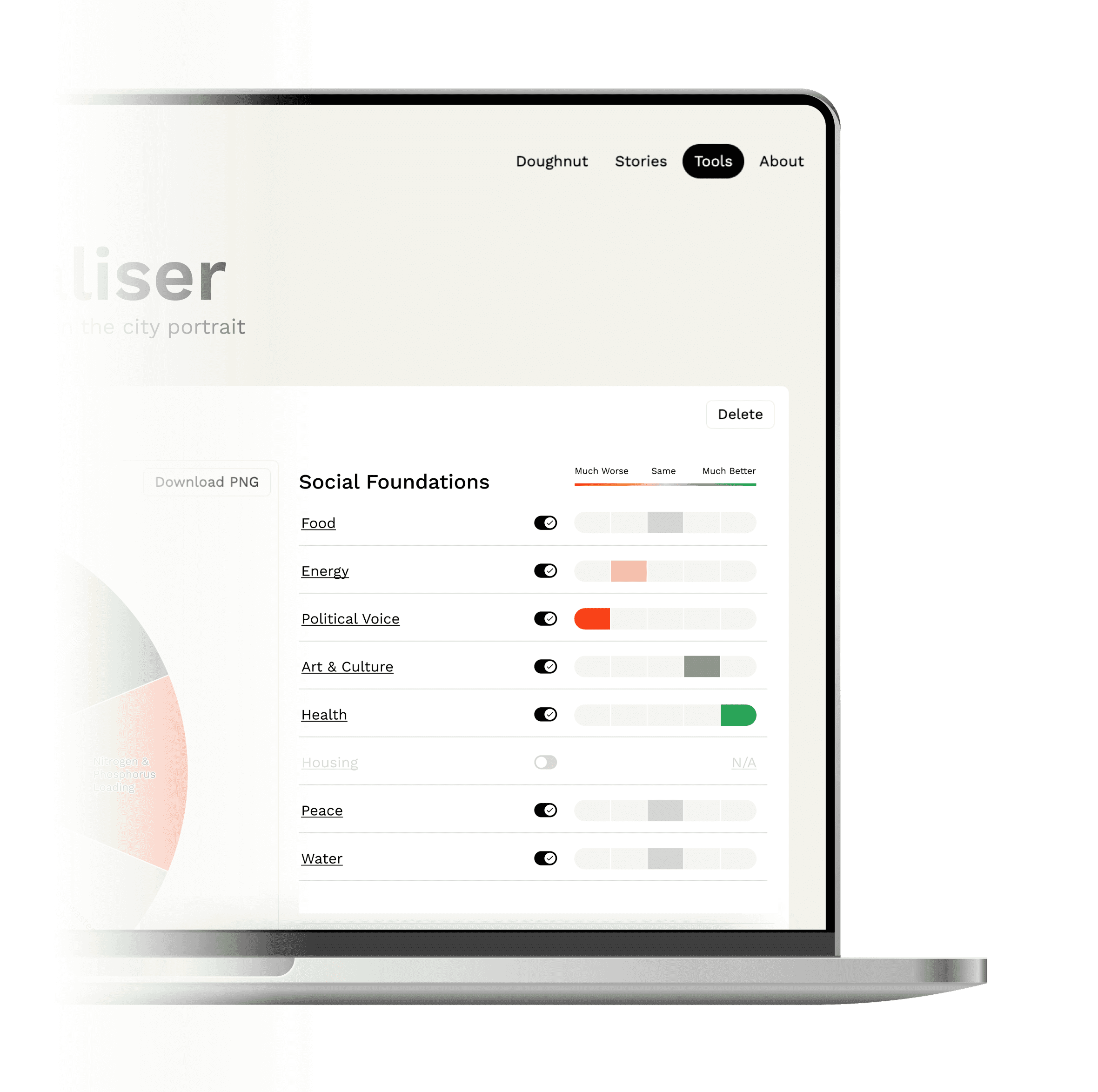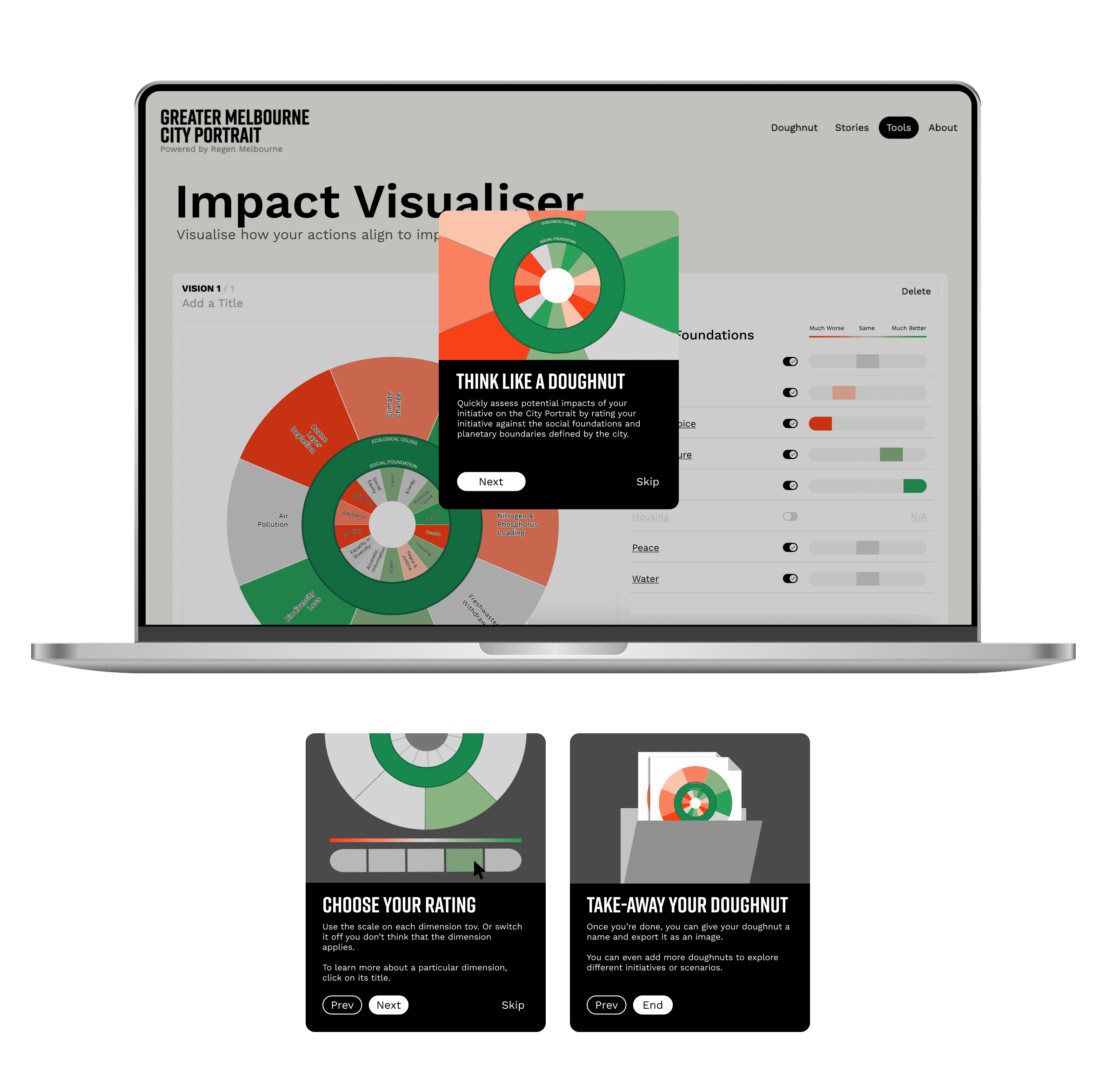 The Doughnut Economics framework helps policymakers and entrepreneurs visualize the social and ecological footprints of their developments. We translated this complex academic theory into an interactive web widget, making these assessments instantly readable for decision-makers. Beyond the interface, I designed a visual system to solve critical accessibility challenges, ensuring the strict data standards remained legible while transforming a theoretical model into a practical strategic tool.