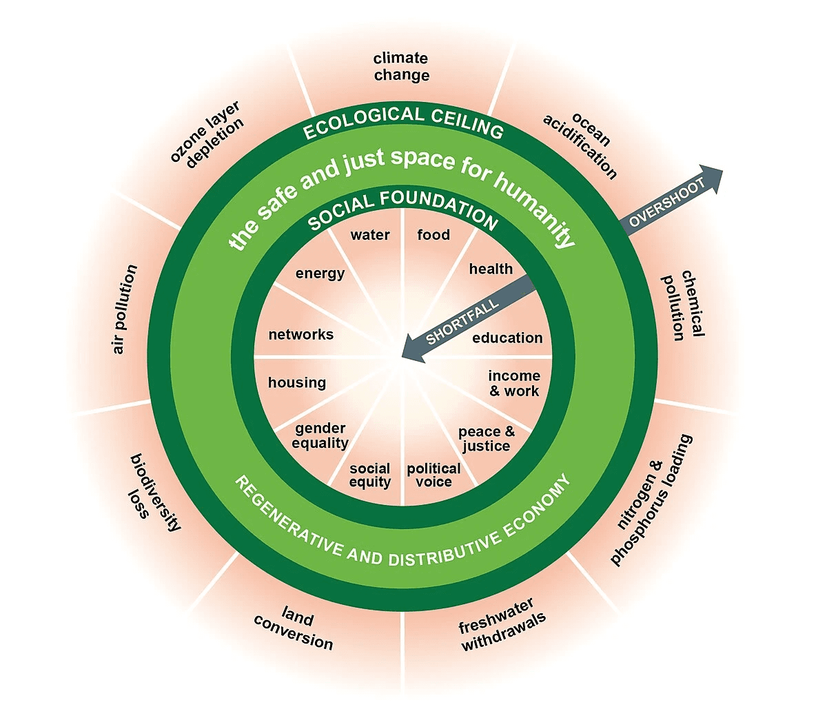 Doughnut Economics is a framework consisting of two concentric rings: a social foundation of human needs (like health and education) and an ecological ceiling of planetary boundaries (like climate change). The goal is to help humanity thrive in the "safe and just space" between them.