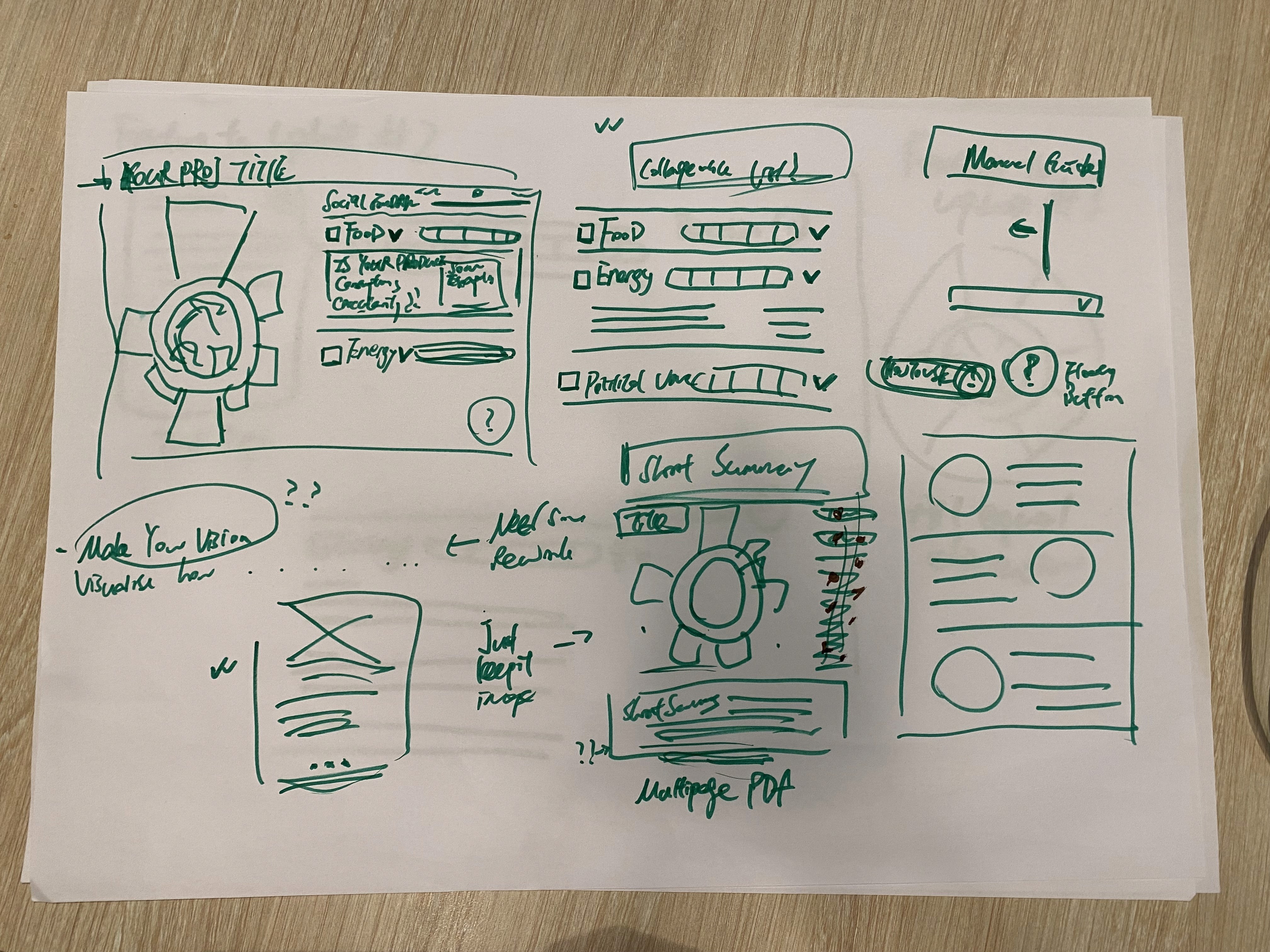 Armed with this insight, I moved to paper sketches. The spatial challenge was real: how do you fit 20+ data points into two rings without it looking like a cluttered dartboard?